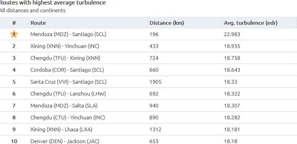 Στη δεύτερη θέση βρέθηκε μια εσωτερική διαδρομή στην Κίνα από το Διεθνές Αεροδρόμιο Xining Caojiabao προς το Διεθνές Αεροδρόμιο Yinchuan Hedong. Το ταξίδι των 433 χλμ. διαρκεί λίγο περισσότερο από μία ώρα, με βαθμολογία αναταράξεων 18,935.Την τρίτη θέση κατέλαβε η πτήση από το Chengdu Tianfu προς το Xining Caojiabao, τις κινεζικές επαρχίες Sichuan και Qinghai, αντίστοιχα, η οποία διαρκεί λιγότερο από δύο ώρες.